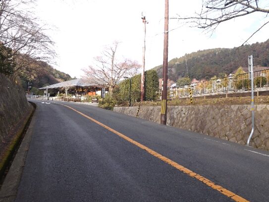 橋を渡り真っ直ぐ進むと茨木能勢線の栗生間谷西交差点に出ますが、その手前の左T字路で右に折れて50m程右の勝尾寺川に先沿って、50m余りで左に曲り茨木能勢線の車道に出て、少し右に折れて車道を横断し(歩道ないので車に注意)左斜めの道に入る