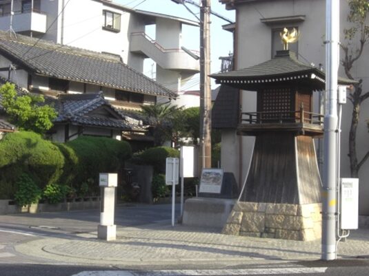 交差点を横断した右角に 常夜灯東高野街道の石碑 灯籠を右に街道を進む