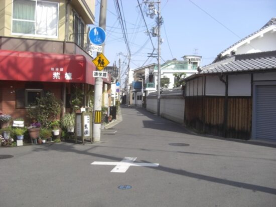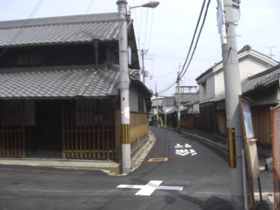 宮前東交差点から100mほど西に進むと、旧家の建物が並ぶ交差点に出る。交差点を南北に進む 中高野街道