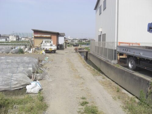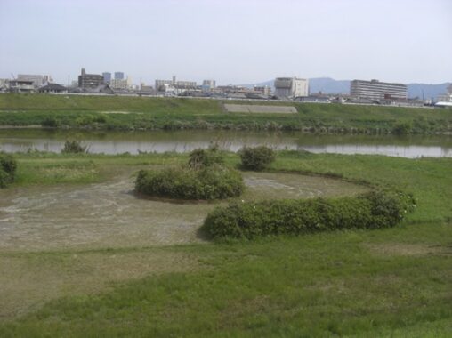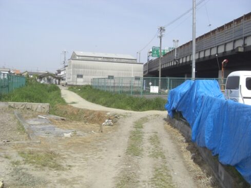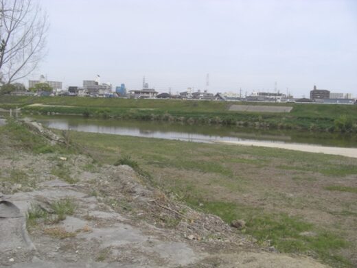 神社を左に真っ直ぐの道は大和川で行どまり。以前はここから左斜めに向って、対岸への川辺の渡し跡