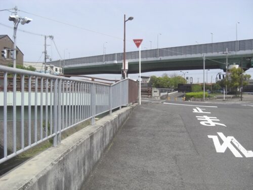角の祠の所で右に折れるが、正面には170号線の外環状線の高架で、高架下は野中南交差点、旧道はかつて右斜めに進み高架下を斜めにあったが今は消失しているので、右の側道を進み、一つ先の野中信号を左に折れて高架を潜る