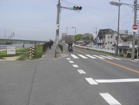 明治橋を渡ると堤防沿い西東の道は 庚申街道 が分岐