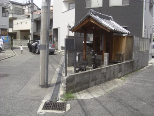 その先、長吉長原で左にカーブする正面右角に 地蔵堂