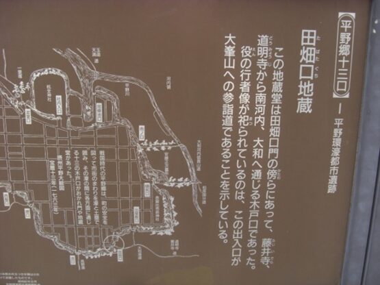 この地蔵堂は田畑口門の傍らにあって、藤井寺、道明寺から南河内、大和へ通じる木戸口であった。役の行者像が祀られているのは、この出入り口が大峯山への参詣道であることを示している