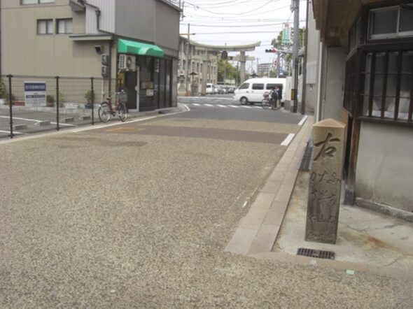 鳥居越しに、古市街道起点の辻を見る