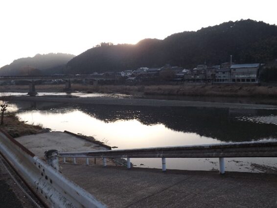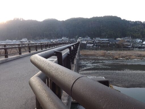 美吉野橋北詰から南詰方向、対岸の六田集落も古い街並みが残っている。対岸から吉野山への道も残る