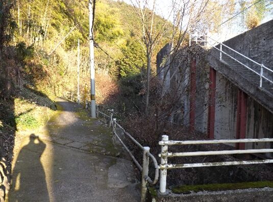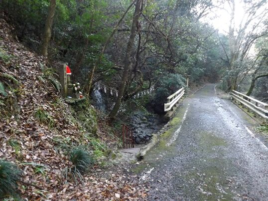 300mほど進むと左側に細い小川とコンクリート塀の間の細い道がある、多分この道だろう左に入る
