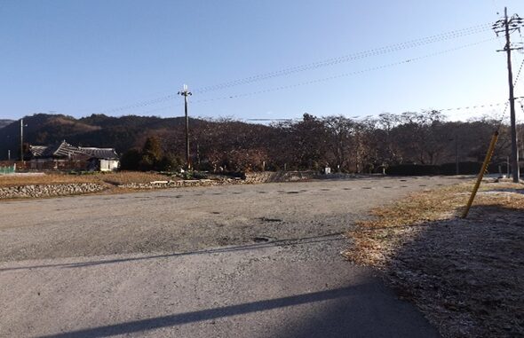 左前方高台には北野地区の新しい住宅地、坂の右手一帯は旧比曽の集落