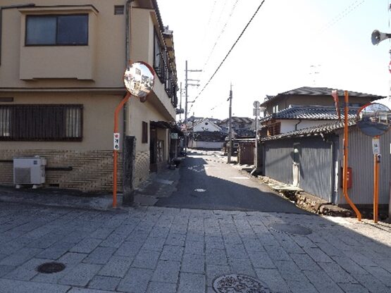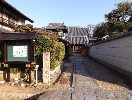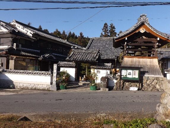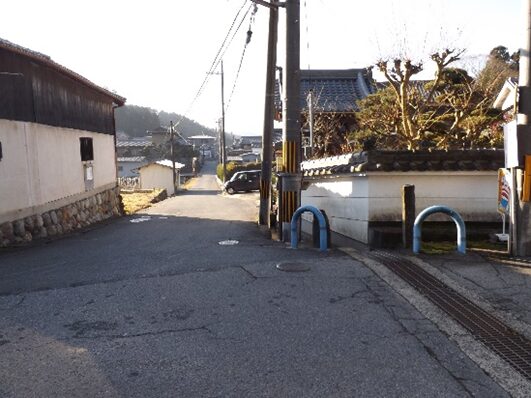 世尊寺の山門前を西へ進み、道なりに左にカーブして新道に出て、右に坂道を上る