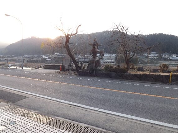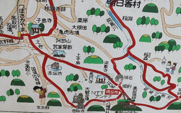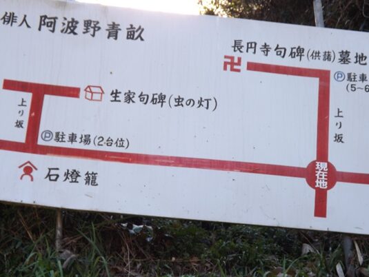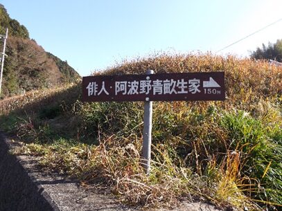 土佐街道の途中左に少し登る舗装道を曲がり進むと、左に燈籠が建っている所を右に進むと、阿波野青敏生家 がある高浜虚子門下の一人で、「西の横綱」ともいわれた郷土出身(高取町上子島)の俳人