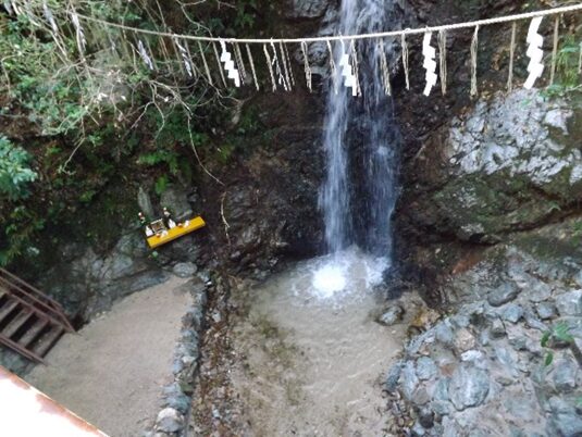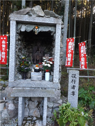 吉野熊野三山の路わけを発願し比曽寺に修行中の役の行者は、この清流で身心を浄め、やがて、伝師に濯頂の戒法をうけ遂に大願を達した行者は、みずから濯頂の滝と名づけた、報恩の為に不動尊をまつり、道中の安全と後世の平安を祈ったと伝えられる。折しも、この地方を襲った伊勢湾台風で流失し、新たに身代不動尊を納めた。その後、比曽川で古い像が発見された。よって、改めて両尊像を安置した。(説明より)