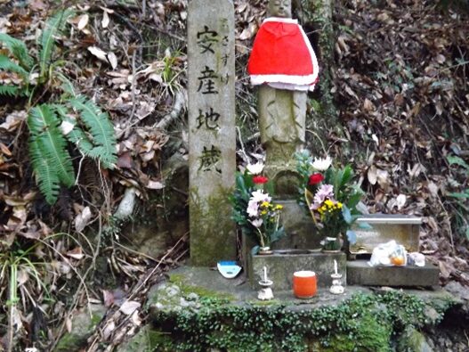 山道の坂を登って行くと、右手に小さな滝が見えてくる。滝の名は「安産の滝」といわれ、昔から大峰詣に向かう修験者たちは、この滝で第1の行としてみそぎをして身を清めた。また近郷の御婦人達は安産を祈願して滝に打たれたといわれる、この滝の上に「安佐寺」があったがいまは何も残っていない明治5年に廃寺となった