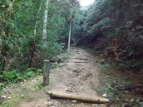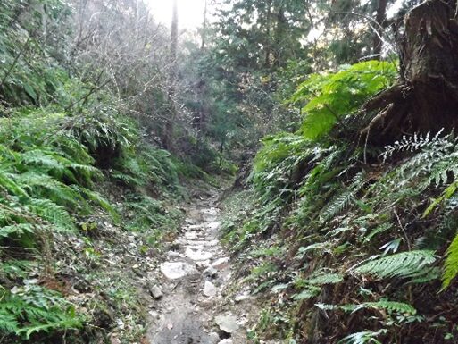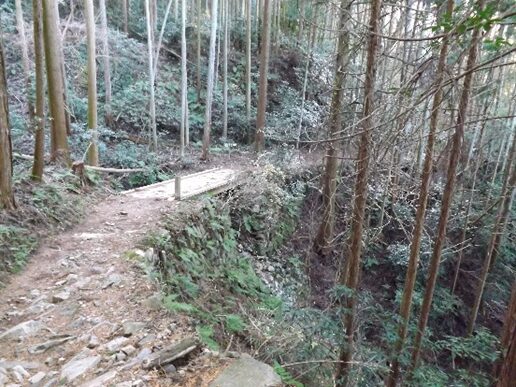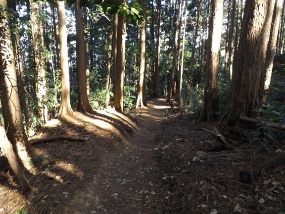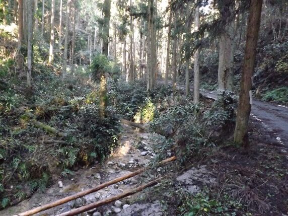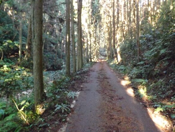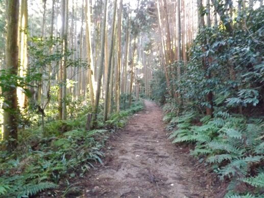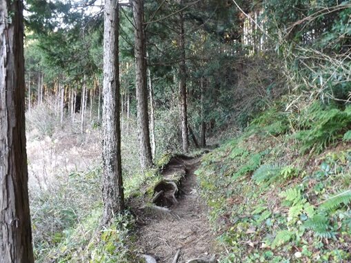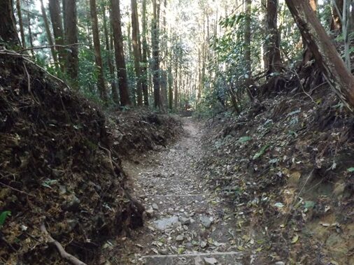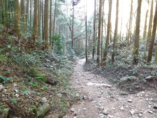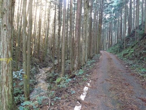 杉・檜林の中の山道を、左に谷のせせらぎを聞きながら緩やかに登る