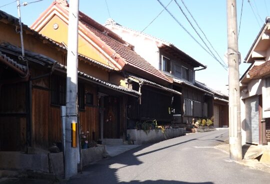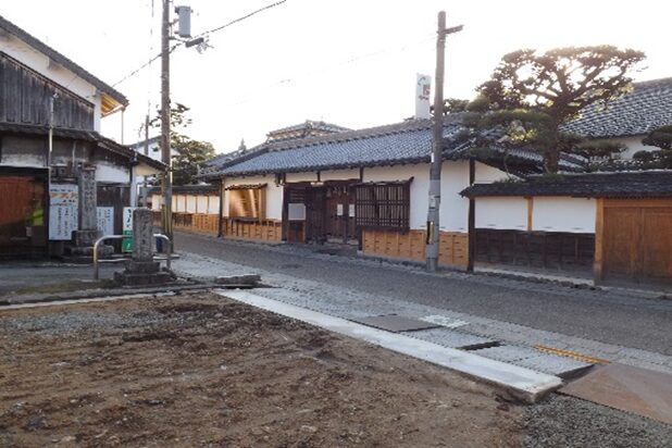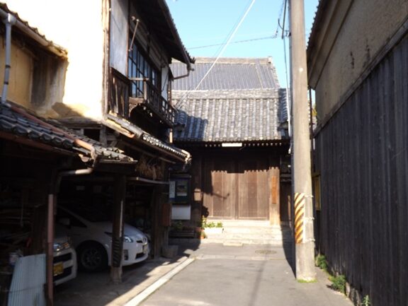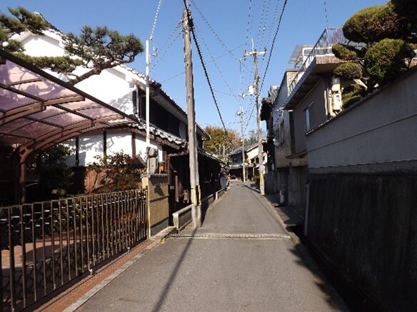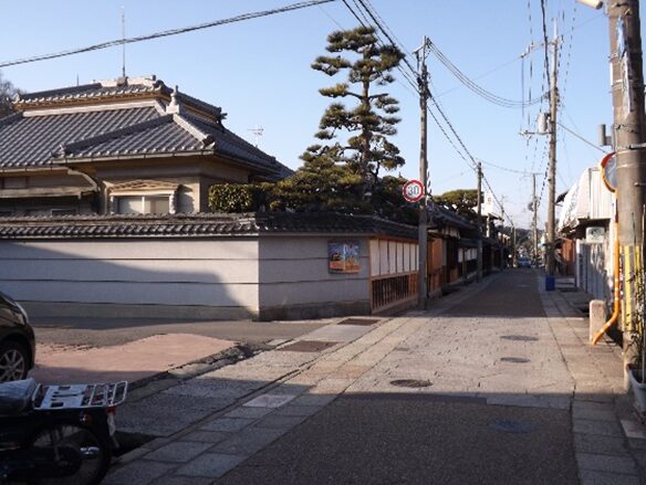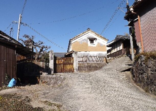 清水谷の街並み左手に、重厚な土蔵が残る大きな家