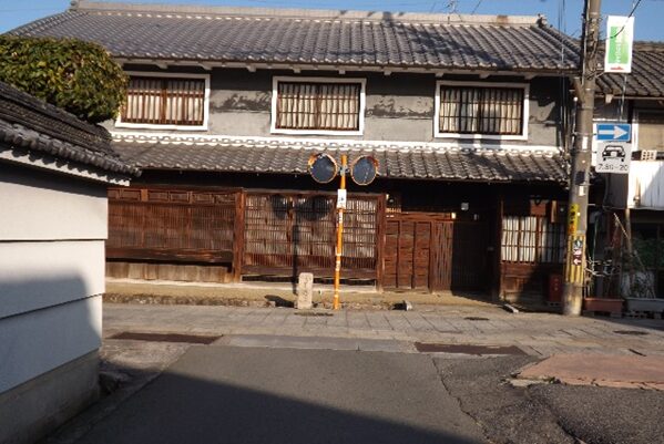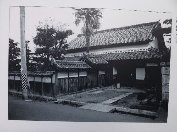 昭和57年ごろに撮影された湯川家住宅の正面構えである。湯川家住宅は旧観覚寺村の北端付近にあり。この辺りは町場の北端に位置し、農村的性格を兼ね備えていた。主屋は街道から少し後退して建てられ、平家建て、切妻造り、桟瓦葺である。上屋の壁面、土壁で塗り込めた大壁造りで、虫籠窓はなく、上屋大棟は青海波積にしている。