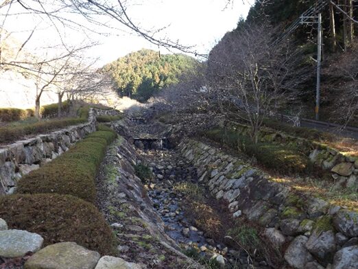 川の向かいに 上子島沢砂防公園 春の桜、初夏の蛍も飛びかう