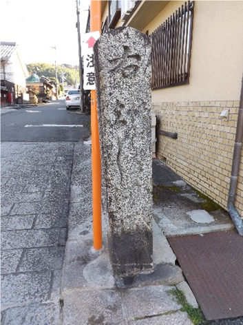 そのすぐ先で左に新しい広い道が、その左角に 池田邸屋敷址の石標