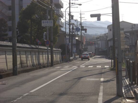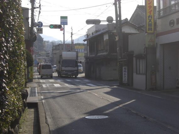 金福寺を右に見て緩やかな坂を少し上ると県道に出ます。出たところから振り返る