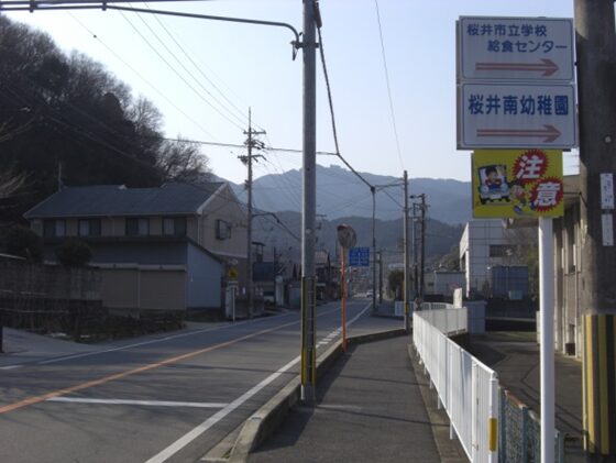 県道を右に折れると、右手に桜井市立学校給食センターがあります。左の山は 鳥見山緑地