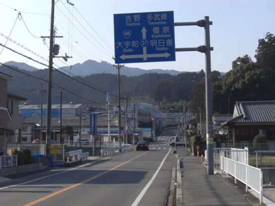 近鉄下市駅近くに車を預け、近鉄電車で桜井駅まで近鉄桜井駅前南口から国道165号線まで進み少し東へいって右(南)へ曲がり、県道37号線桜井吉野線に沿って進む道。