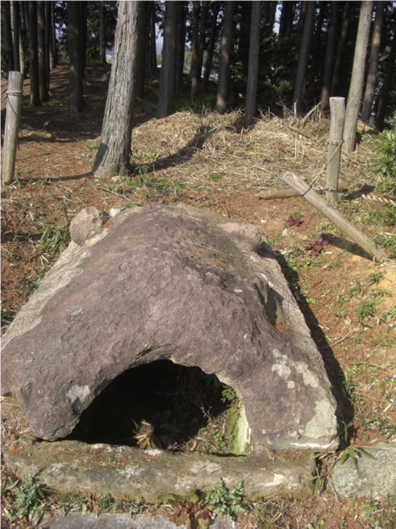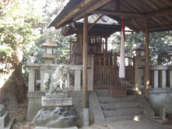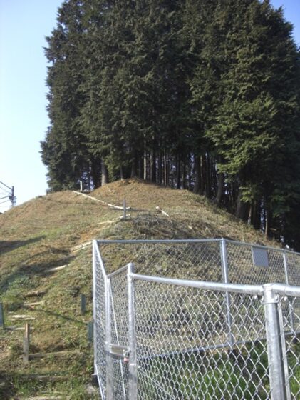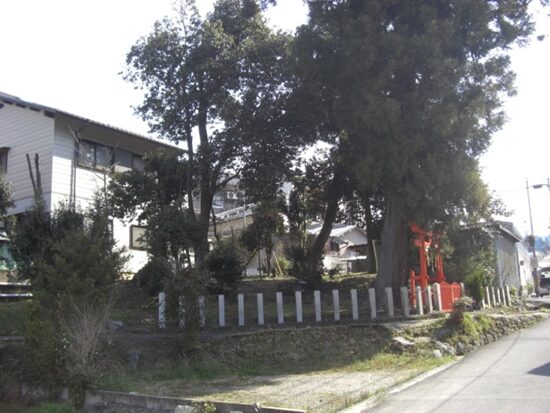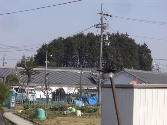 八坂神社の少し先、坂を上る途中右手にこんもりとした森が見えるところが カブト塚古墳 街道より右に少し入るとカブト塚古墳