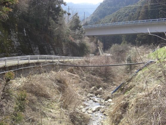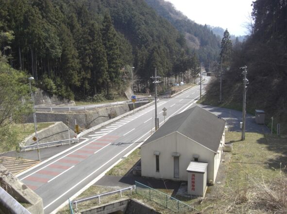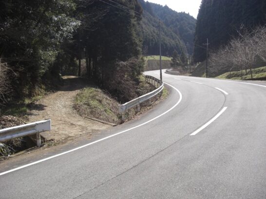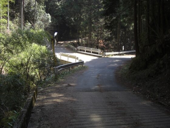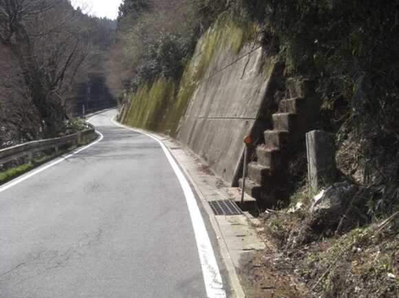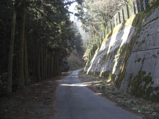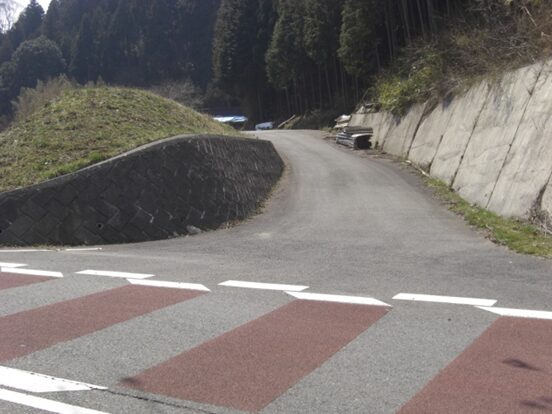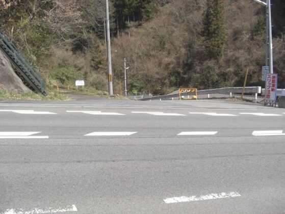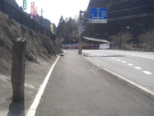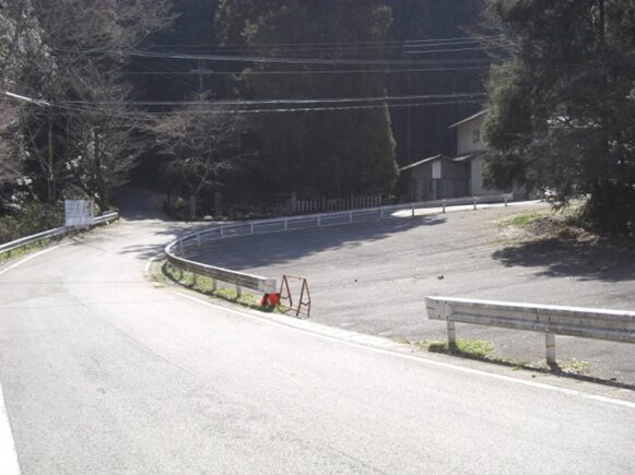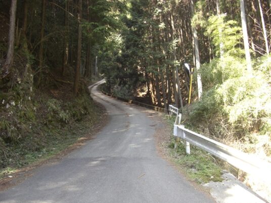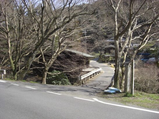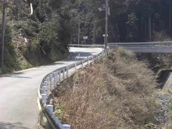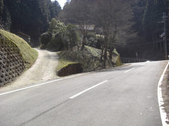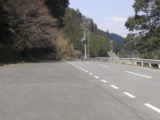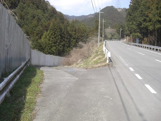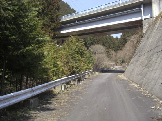 県道を進んでいくと信号交差点で左から県道28号に合流し緩やかな坂を左に大きくカーブしながら下ると、その先で、左の山裾に入る旧道があるので、そこを入ります