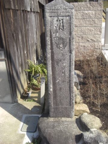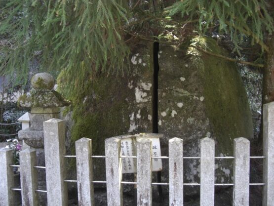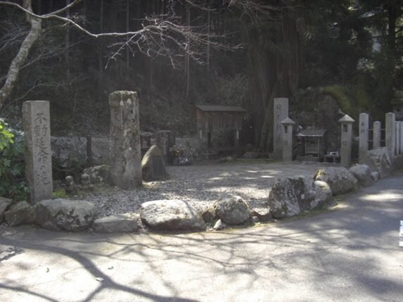 右にカーブする旧道左手に 破不動尊 という大石が横たわり、側面に北向きの不動明王が彫られ祀られている。大石は中央が刀で切ったように両断され割れている