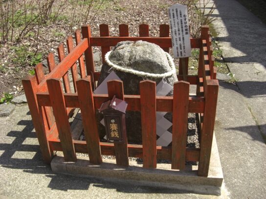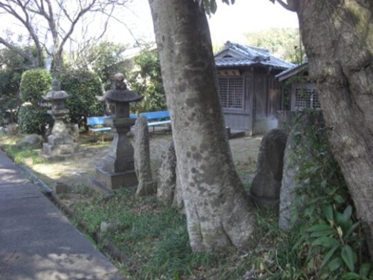 右に曲がる交差点の北東角に 常夜燈と石碑 が並んでいる、石碑には「…大明神」と刻まれています