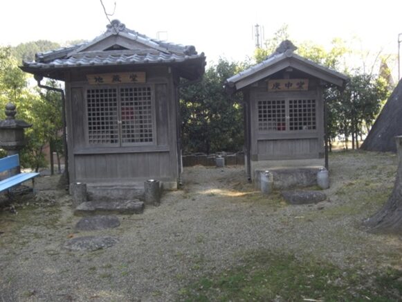 その先、左の高台に 庚申塔、地蔵堂、常夜燈、石碑 が並んでいます