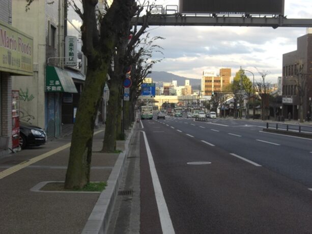南京終町を進み、左におかたに病院、右に春名病院を見て進む