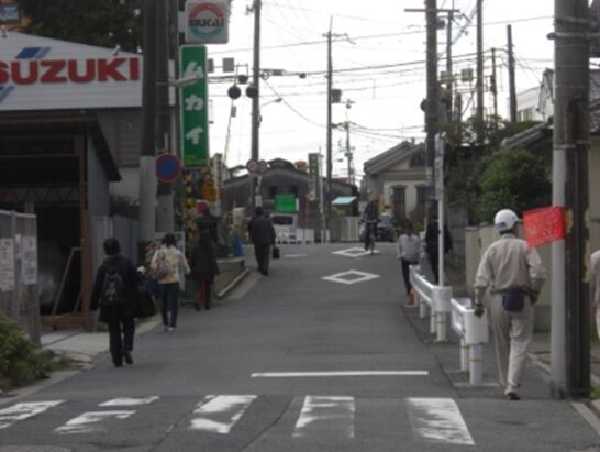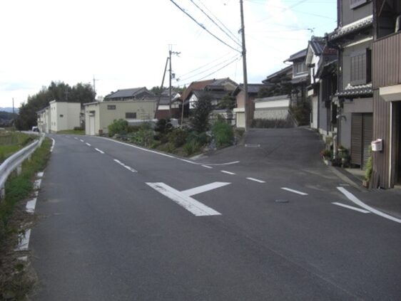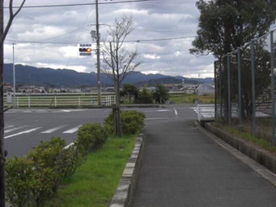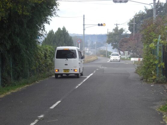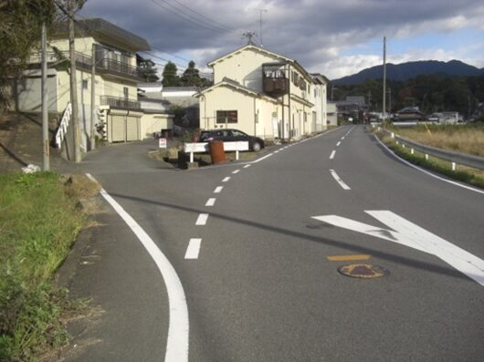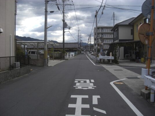 小学校の過ぎた先で十字路を横断して進む