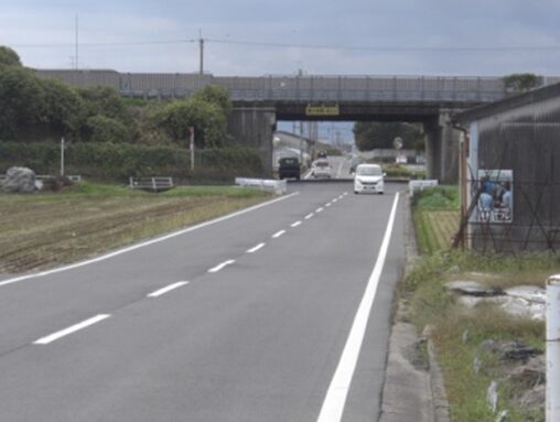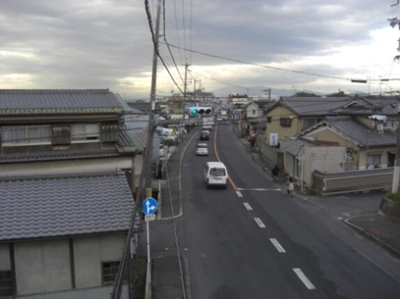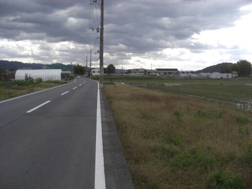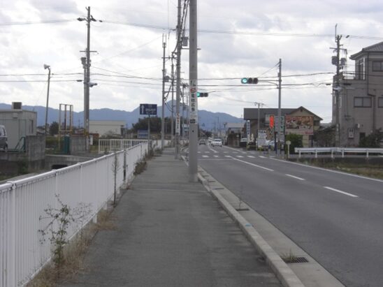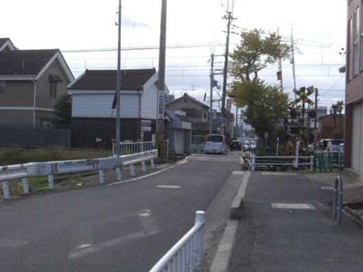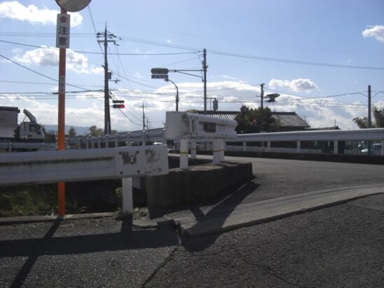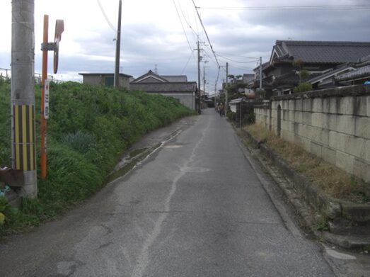 左にカーブしたところでJR桜井線の踏切を渡り、南へ再び真直ぐの道