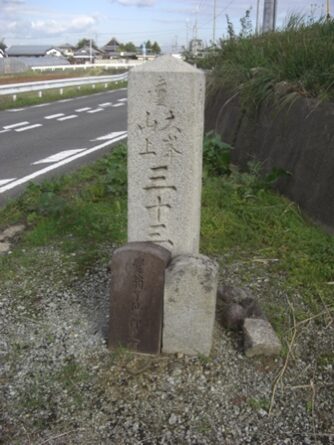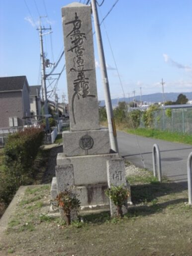 池が切れる直に左櫟本町の 道標 「大峯山上 三十三・・・・・」 「西 右 丹波市 左 郡山道」