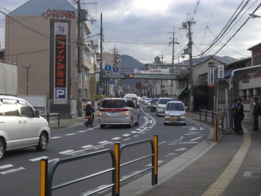 合流して南下する右側の町並みの背後には東九条池がある。道沿いには店舗や食堂が並び街道の面影は全く感じられない