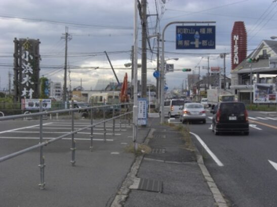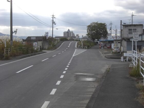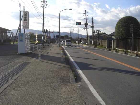 400m程進み左に済美小学校の交差点で右から自動車道が合流。信号を横断し左斜め(南東)に進む