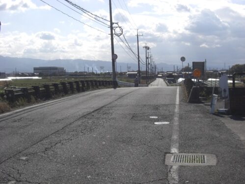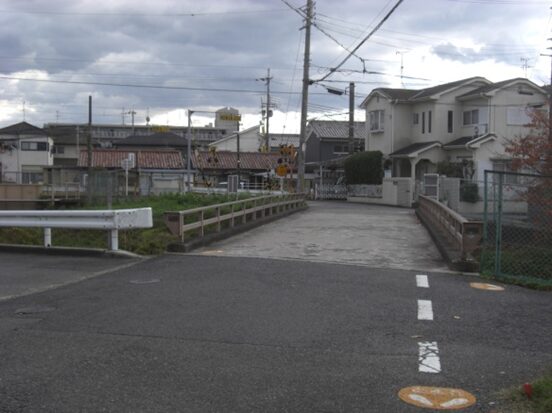踏切より600m程、更に南下したところで、能登川に架かる橋を渡り橋の南袂を右に折れカーブし道なりに進みながら南へ。南京終町を進む