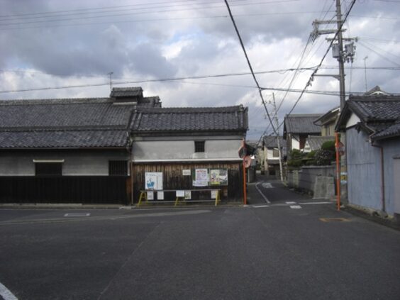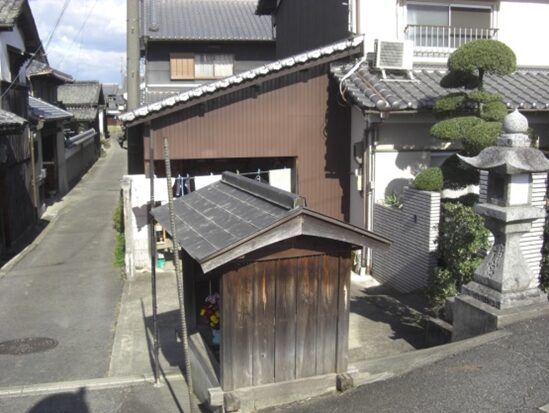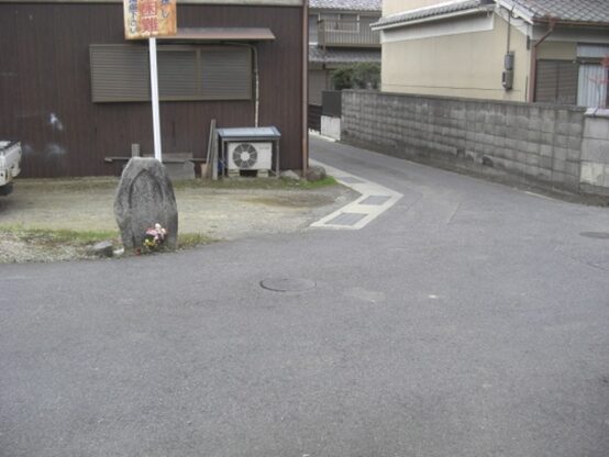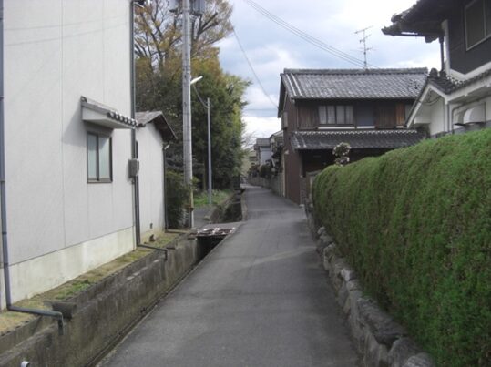 左角に祠がある辻で左に曲がる、この辻、東西の道はかつての 奈良横大路 との交差点です