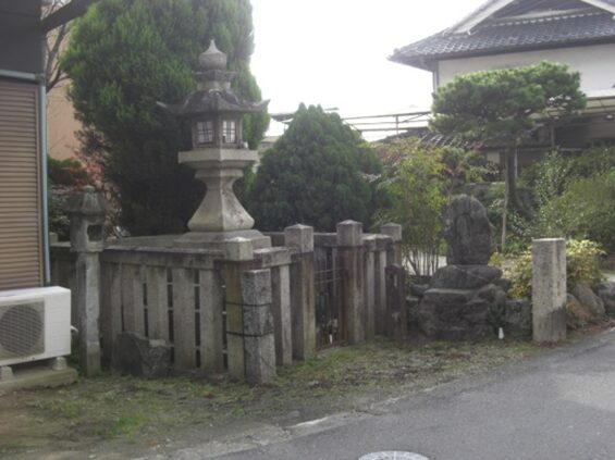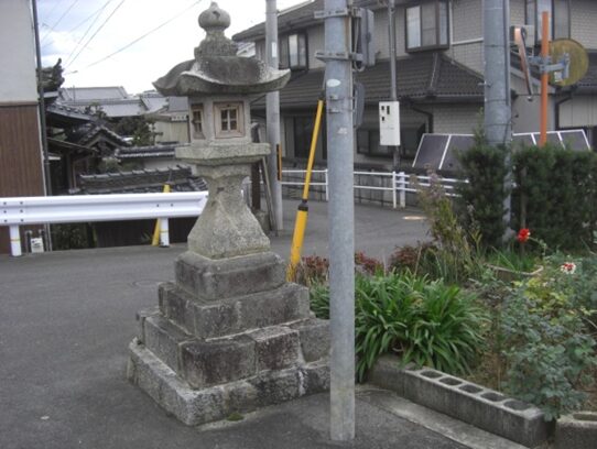 交差点を越えた右に 祠と石碑と常夜灯
