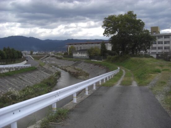 少し歩き右にセブンイレブンの先で左に折れて、布留川に架かる富杉橋を渡り、東側の川沿いの街道を南へ。橋を渡った正面には市立病院が建つ