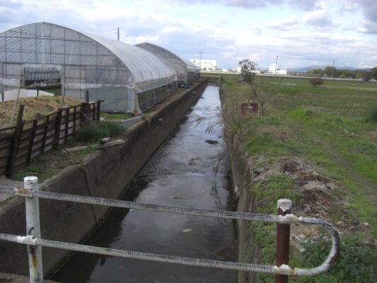 対岸に出て少し対岸のビニールハウスの間を進むと、カーブミラーのある舗装の道に出た。舗装道を更に越えて、畦道を進む
