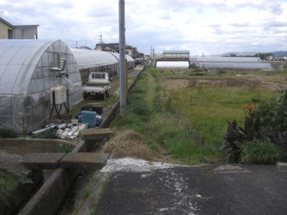 畦道の先、ビニールハウスの手前が小川になっていて橋が架かっていなく渡れないので困った、飛び越えれないほど幅が広い、ここで旧道は消失。左右さがしたがない