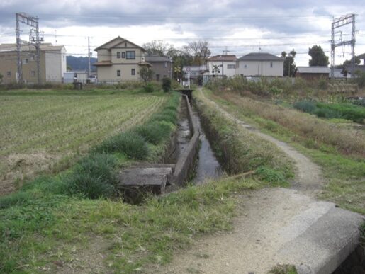 住宅前の舗装がなくなり地道の側溝沿いの畦道を南下。その先で、近鉄大阪線の踏切を越える。右に耳成駅
