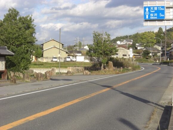 坂を下りきると、街道は車道のT字路に出るので右に折れる。左に進むと桜井市街地