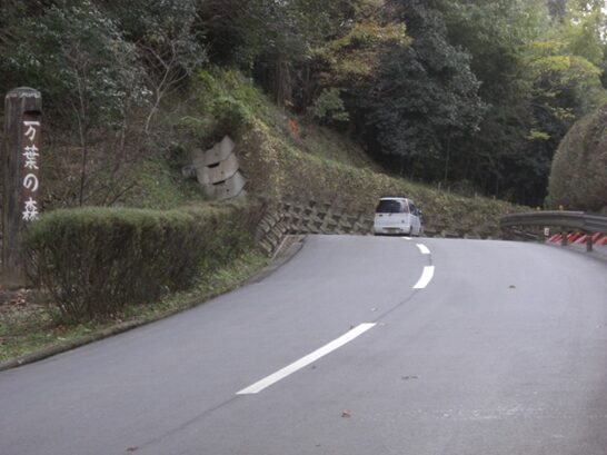 綺麗な山裾の道だが、昔はおそらく峠道であったのだろう。万葉の森の標識が建っています