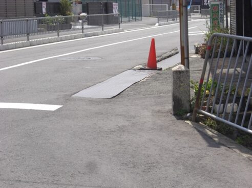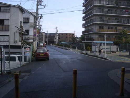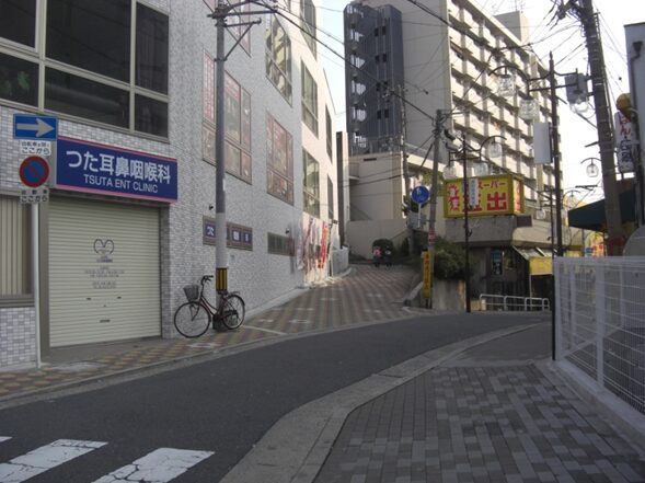 左にパナソニックケアサービスのビルを見て右にカーブする