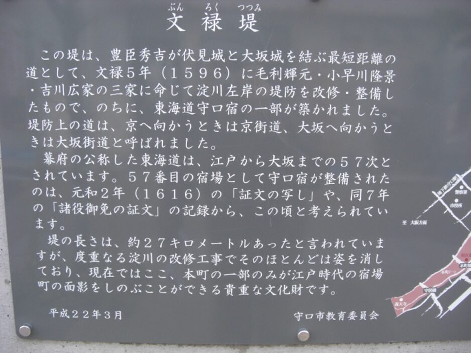 守口駅北口前を少し歩いて 文禄の堤跡、京街道の辻 に出る