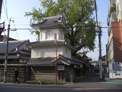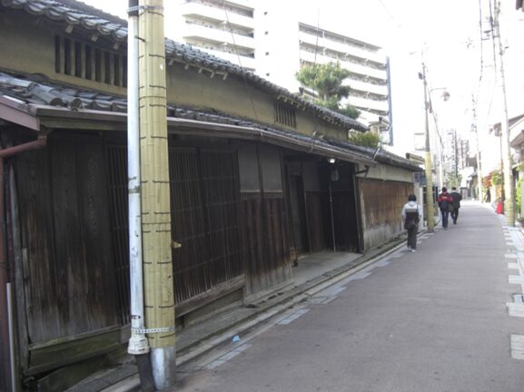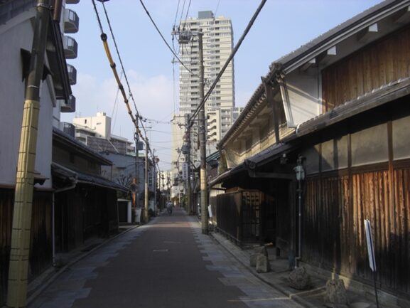宿場の雰囲気を残す堤両側の民家と背景の近代ビル