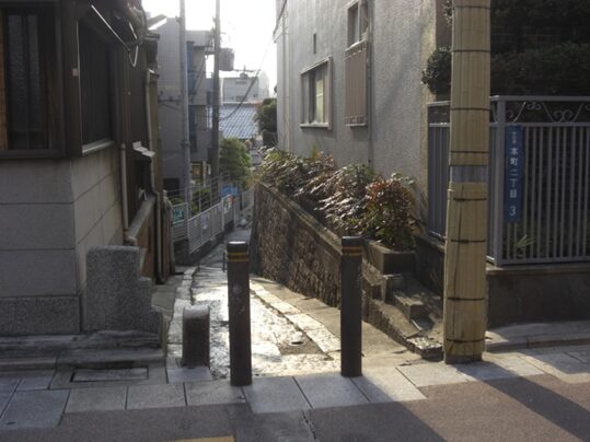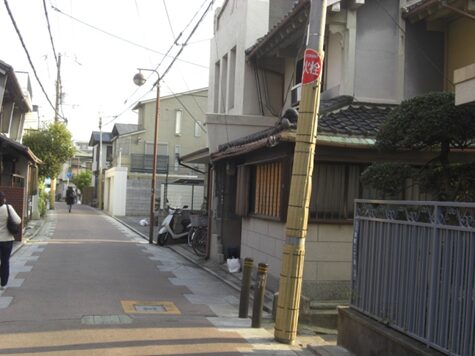 200m程歩いたところ右手に鉄杭のした、下りていく細い道が京街道と分かれる守口街道の分岐点。