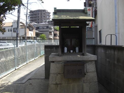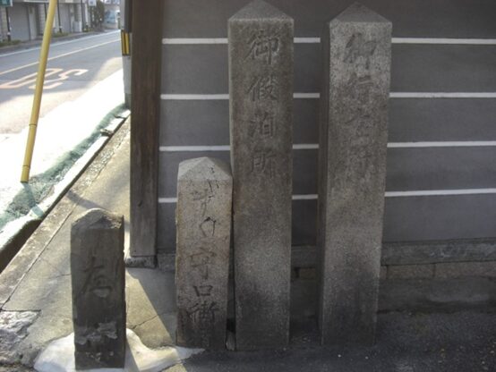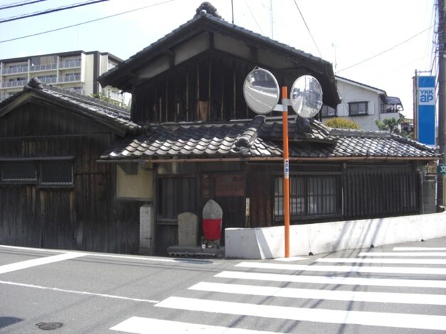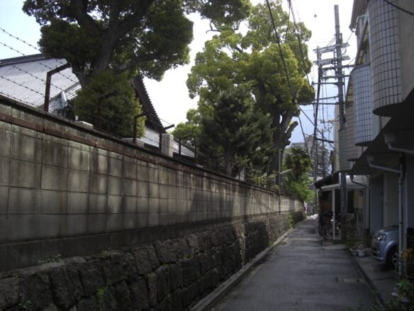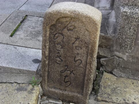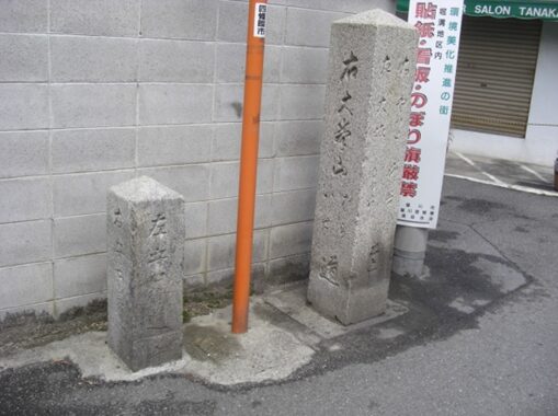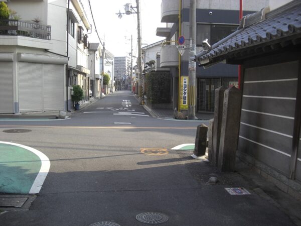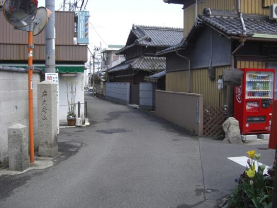 難宗寺北東角の道標この交差点の辻は、向かって左から京街道が来てここで左に曲がる。そのまま右にいくのが放出街道