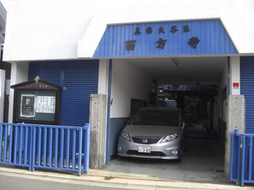 街道沿い左手に寺らしくない寺 真宗大谷派西方寺